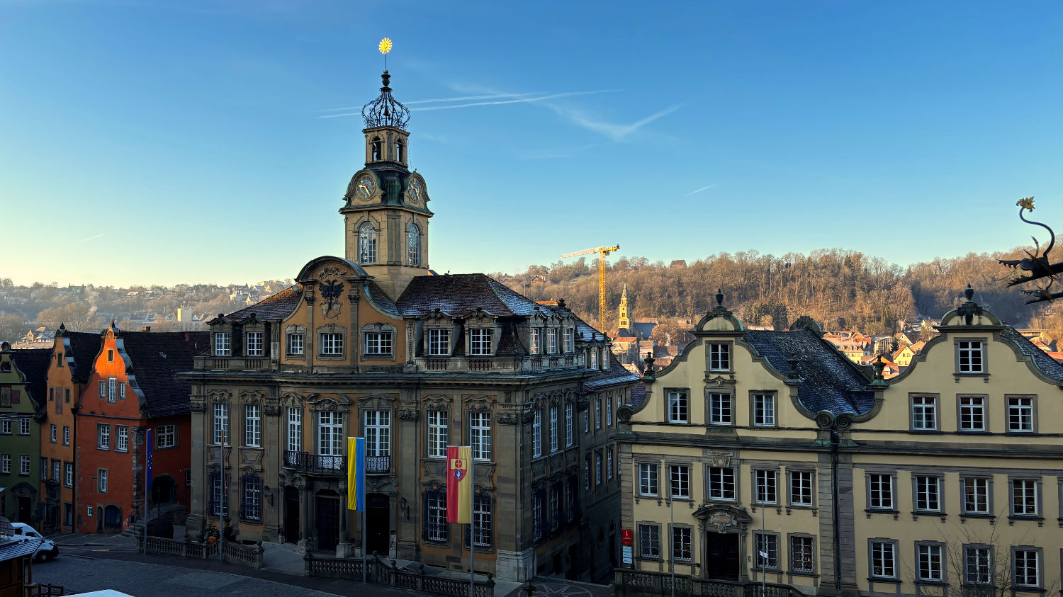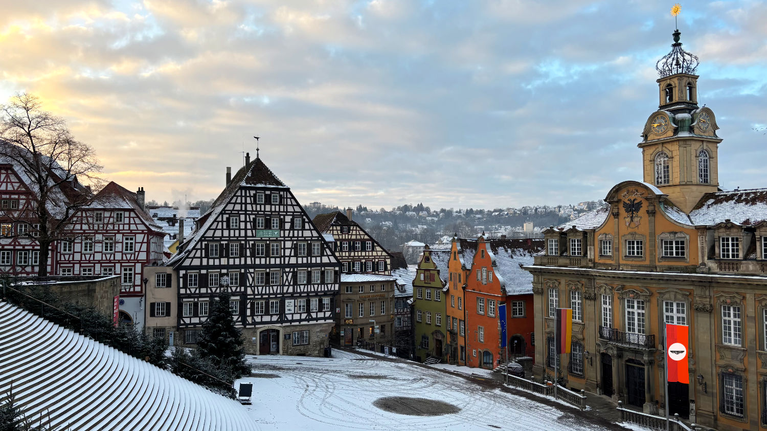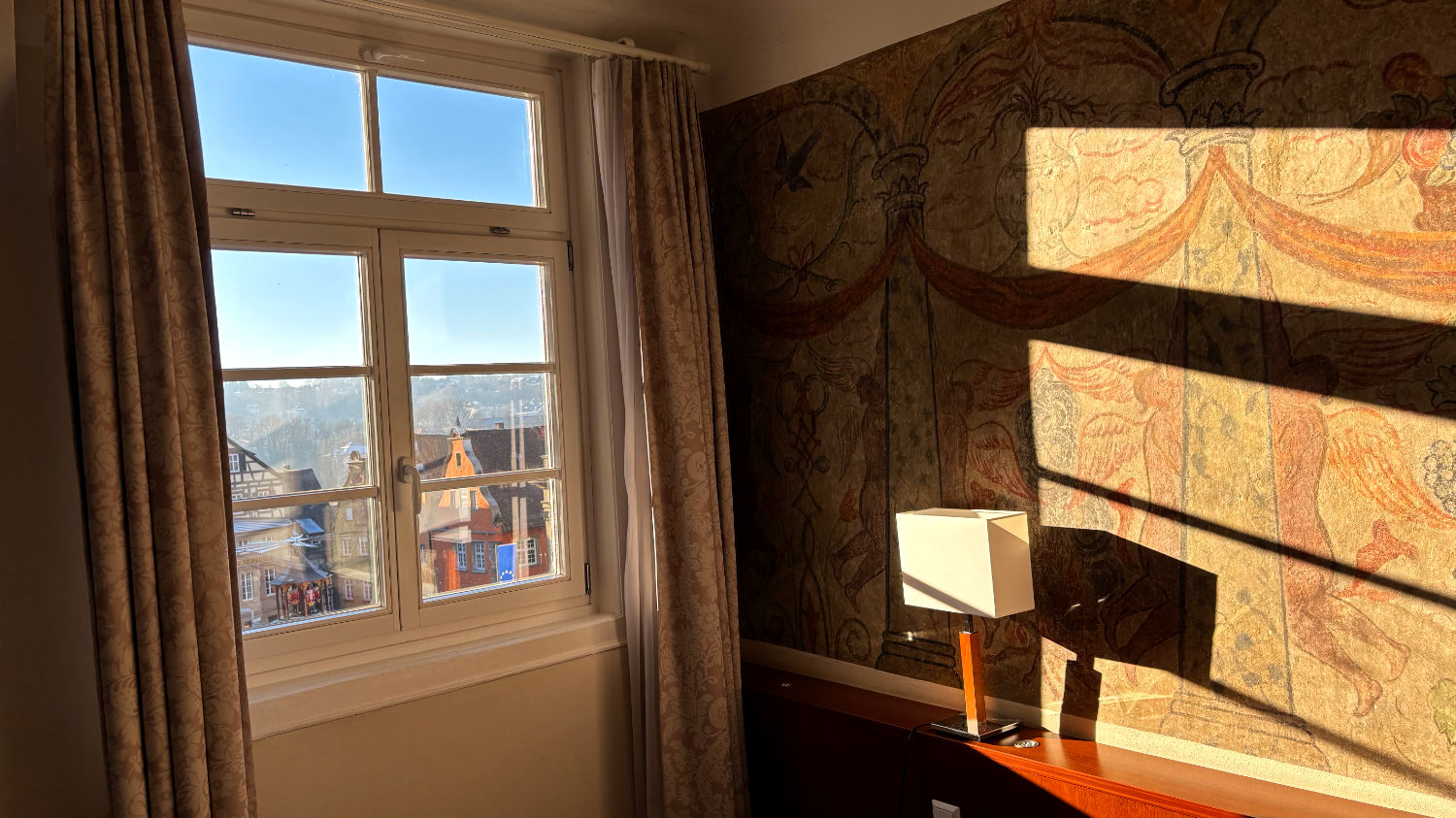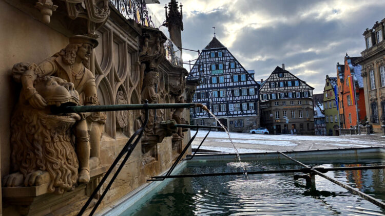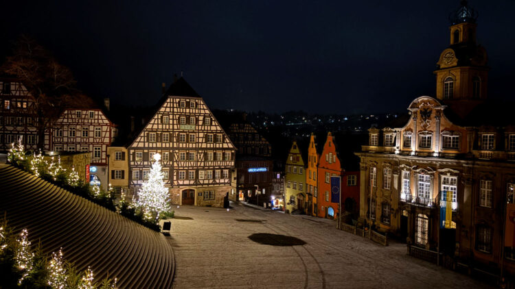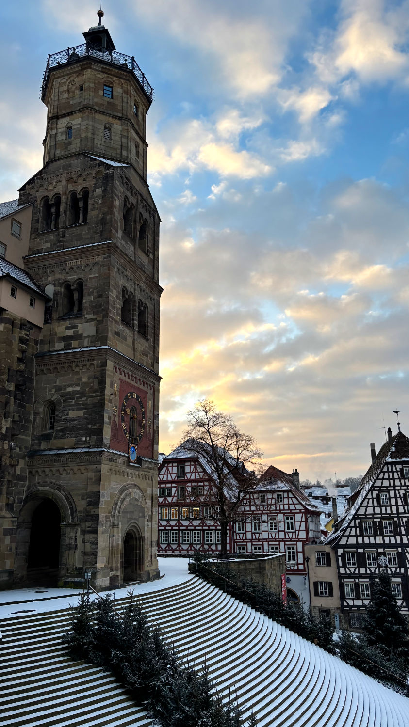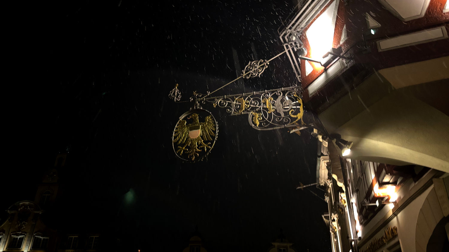Am 28 Dezember machen wir uns also bei bestem Wetter auf den Weg nach Schwäbisch Hall. Wir reservieren uns ein Zimmer im Hotel Goldener Adler. Ricard empfahl uns das Hotel Hohenlohe, ein ebenso schönes wie teures Hotel – zumindest im für uns in Frage kommenden Zeitraum. 91€ pro Person/pro Nacht fanden wir etwas zu heftig, zumal wir das im Preis enthaltene Thermalbad wohl eh nicht hätten besuchen können. Wie sich bei unserer Ankunft herausstellte, war das Hotel Goldener Adler eine gute Alternative. Wir bekommen ein Zimmer mit Erker und Blick auf den schönen Marktplatz von Schwäbisch Hall. 😃 Für 95€ + 10€ Parken pro Zimmer/Nacht kann man sich nicht beschweren.