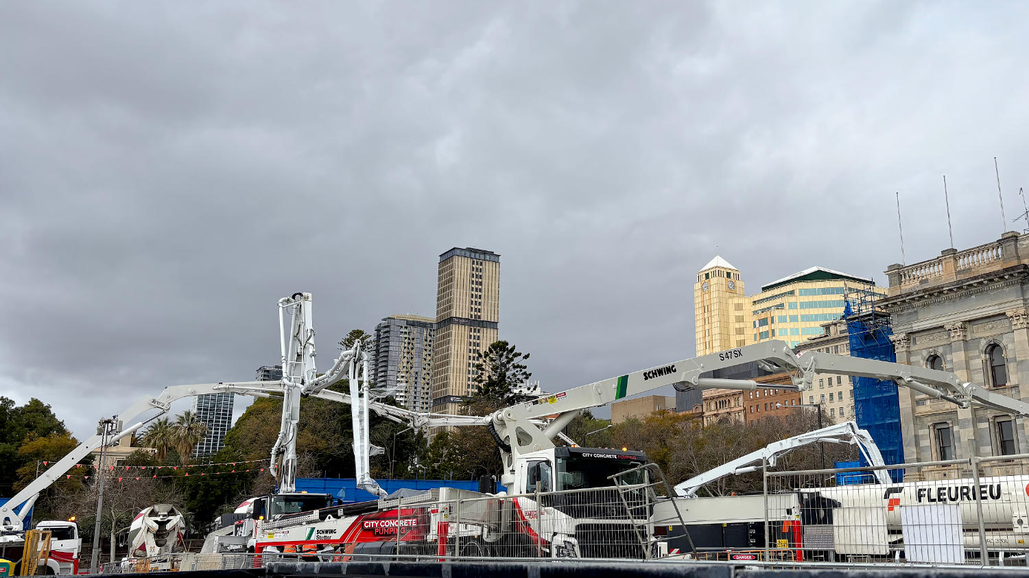 Wir beschließen, ein bisschen durch die Stadt zu cruisen, um uns einen Überblick zu verschaffen und kommen genau 2 Kilometer weit. Das Problem: eine Baustelle mit 4 Betonpumpen. Daran kommt die große Pappnase nicht vorbei. 😄