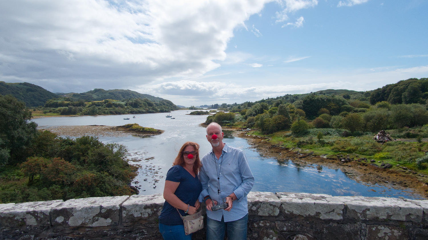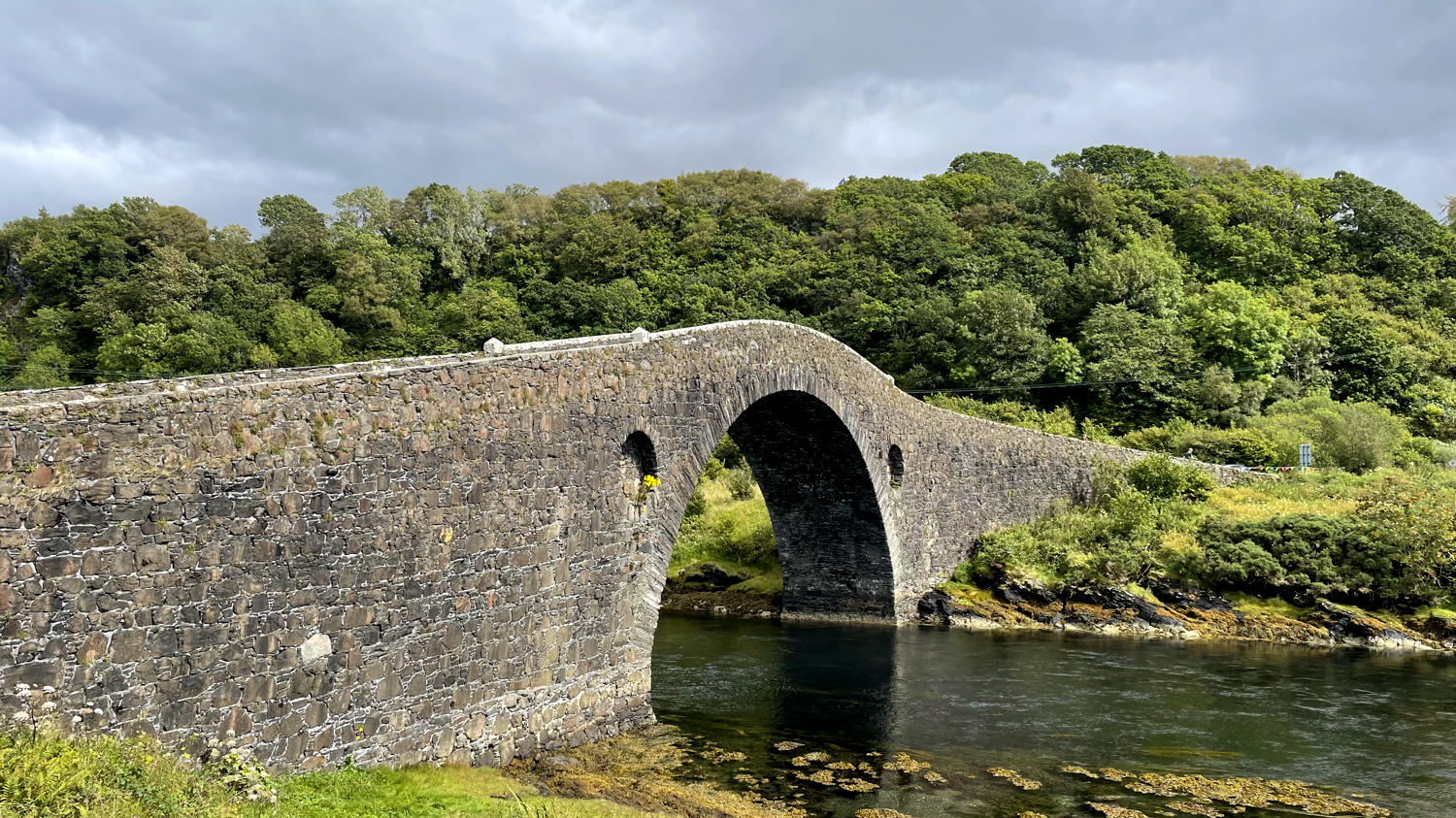 Ebenfalls an der A816 steht ein unauffälliges Schild mit der Aufschrift: „Atlantic Bridge, Isle of Seil“. Die hübscheste Pappnase findet heraus, dass die besagte Brücke wohl die kleinste Brücke über den Atlantik sein soll. Witzig. Und spannend. Wir drehen also um und wollen uns die Brücke mal genauer anschauen. Die Clachan Bridge verbindet das Festland mit der Hebrideninsel Seil und unten durch fließt ein Meeresarm, der nach wenigen Kilometern Länge tatsächlich nördlich und südlich im Atlantik mündet. Sehr schön. Sowas mögen wir – auch wenn es bestimmt irgendwo noch eine andere „kleinste Atlantikbrücke“ gibt, diese hier ist sicher eine der schönsten.