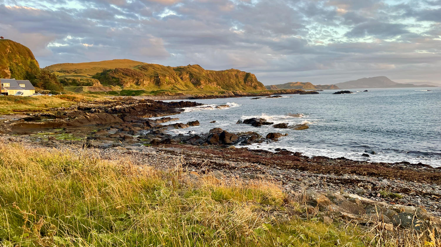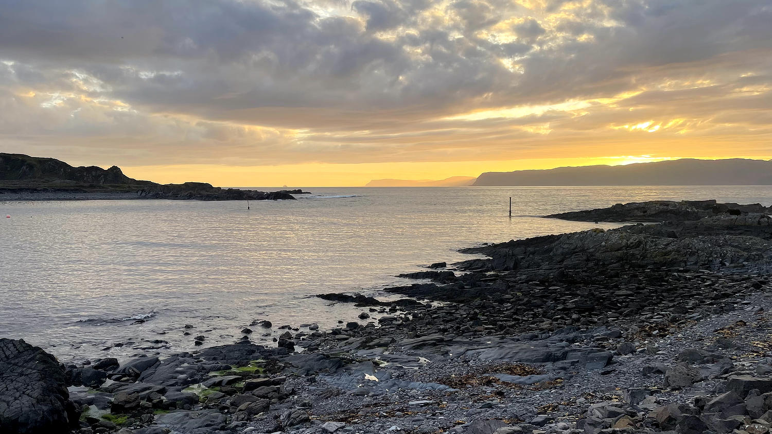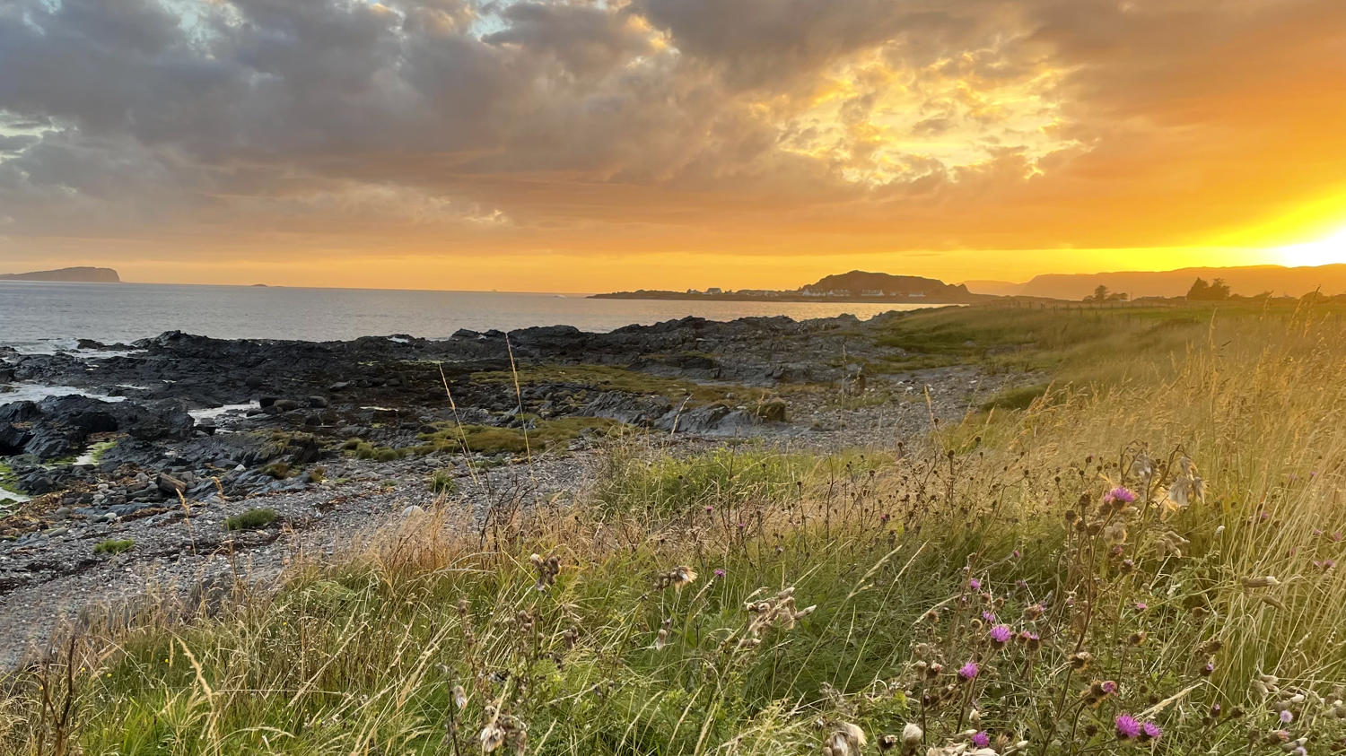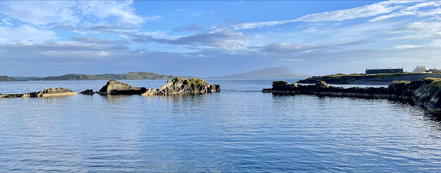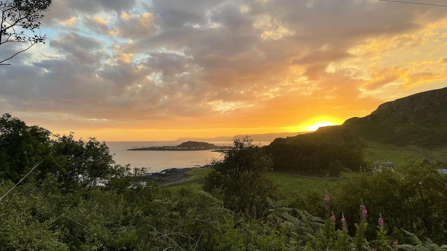 Und wenn wir nun schon mal auf einer Insel sind, kann man die ja auch gleich erkunden. Wir landen am südwestlichen Zipfel der Insel in einem Ort, der scheinbar keinen Namen hat. Dafür hat er ein(e) coole Bar/Pub/Restaurant/What ever. Auf jeden Fall kann man dort bei schönem Wetter – und das haben wir gerade – auf einer Terrasse mit Blick aufs Meer sitzen. Und lecker Essen gibt’s auch noch – genau unser Ding. Wir kosten unseren letzten vollständigen Tag in Schottland genüsslich aus und freuen uns über das perfekt passende Wetter. Wir fahren erst gegen Abend wehmütig zurück Richtung Dalmally. Die Insel Seil verabschiedet uns mit einem wunderschönen Sonnenuntergang. Oh man, wir vermissen Schottland jetzt schon.