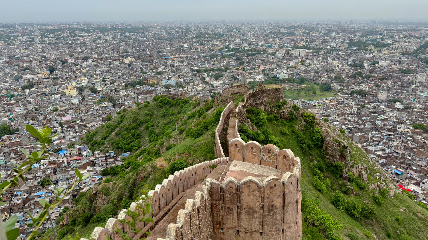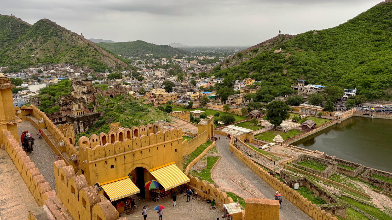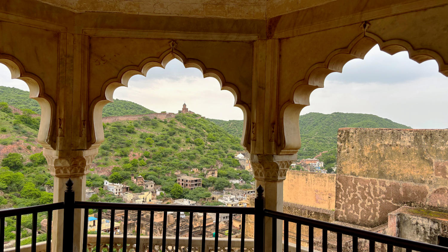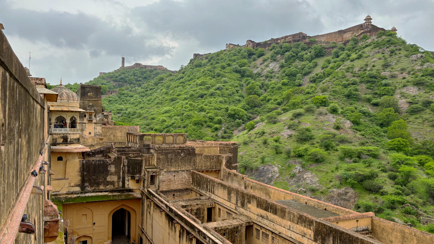 Nach Fort Amber fahren wir zum nahegelegenen Nahargarh Fort. Sollen wir es auch hier kurz machen? Okay. Kann man gesehen haben, muss man aber nicht. Mag sein, dass es bei Sonnenuntergang einen reizvollen Blick auf die im Tal liegende Stadt bietet, aber dazu muss man unserer Meinung nach nicht ins Fort. Dazu eignet sich auch der Jal Mahal View Point. Man hat von dort einen Blick auf das malerisch am Fuß des Berges gelegene Wasserschloss, das dem Punkt seinen Namen gibt und große Teile der historischen Altstadt. Wer braucht schon eine Aussicht auf die vergleichsweise unattraktive Neustadt?