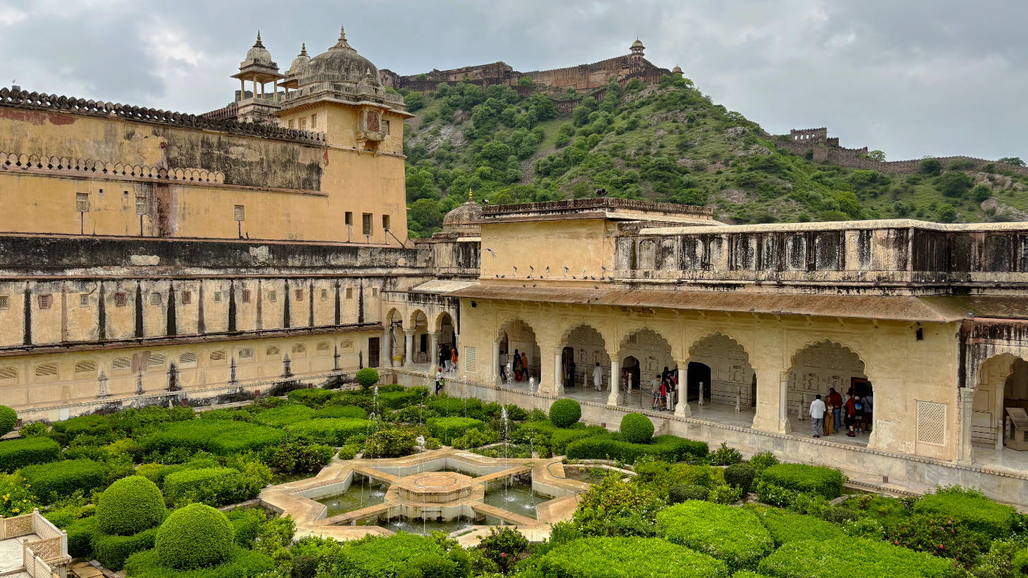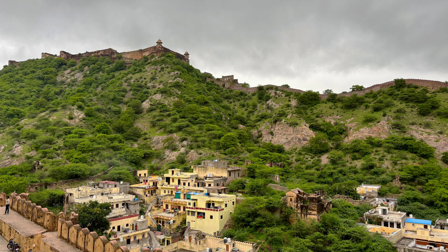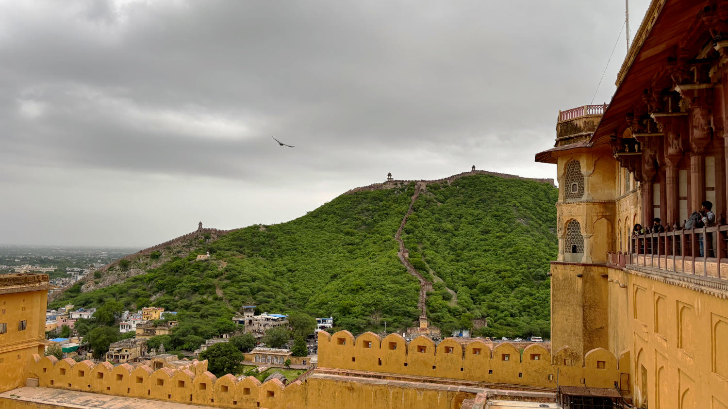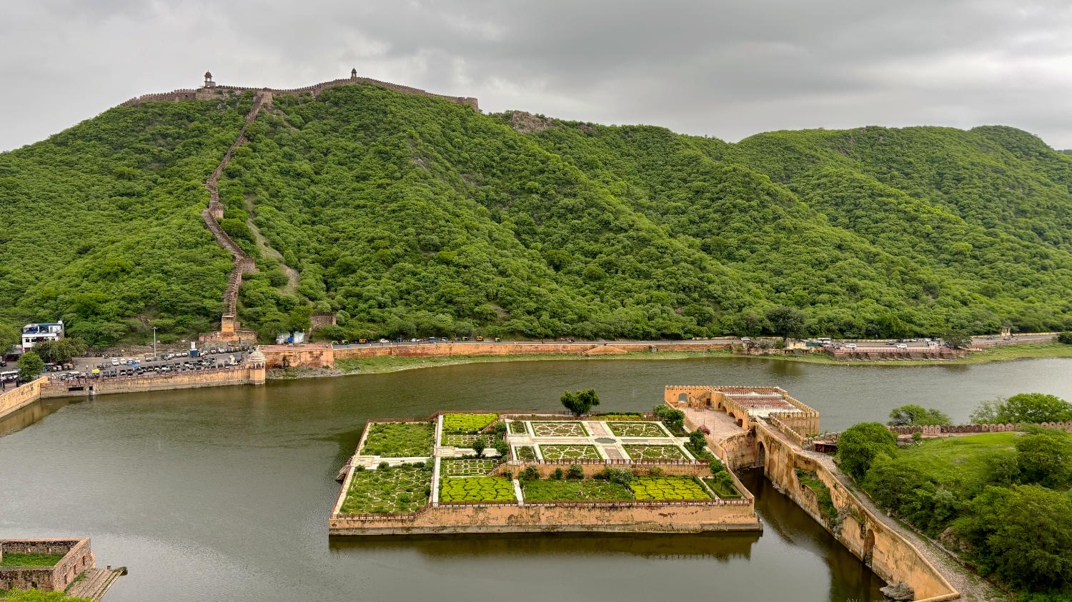 Nach Fort Amber fahren wir zum nahegelegenen Nahargarh Fort. Sollen wir es auch hier kurz machen? Okay. Kann man gesehen haben, muss man aber nicht. Mag sein, dass es bei Sonnenuntergang einen reizvollen Blick auf die im Tal liegende Stadt bietet, aber dazu muss man unserer Meinung nach nicht ins Fort. Dazu eignet sich auch der Jal Mahal View Point. Man hat von dort einen Blick auf das malerisch am Fuß des Berges gelegene Wasserschloss, das dem Punkt seinen Namen gibt und große Teile der historischen Altstadt. Wer braucht schon eine Aussicht auf die vergleichsweise unattraktive Neustadt?