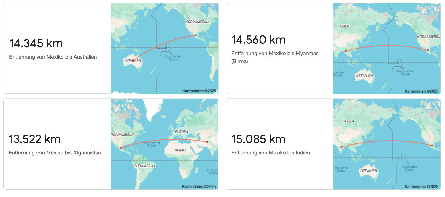 Und damit dieser Post doch noch etwas Positives hat: wir sind gerade scheinbar am weitesten entfernten Ort von Mexiko. Also nicht dass es toll ist, weit weg von Mexiko zu sein – ganz gewiss nicht – aber es ist wieder ein neuer Meilenstein. 😃