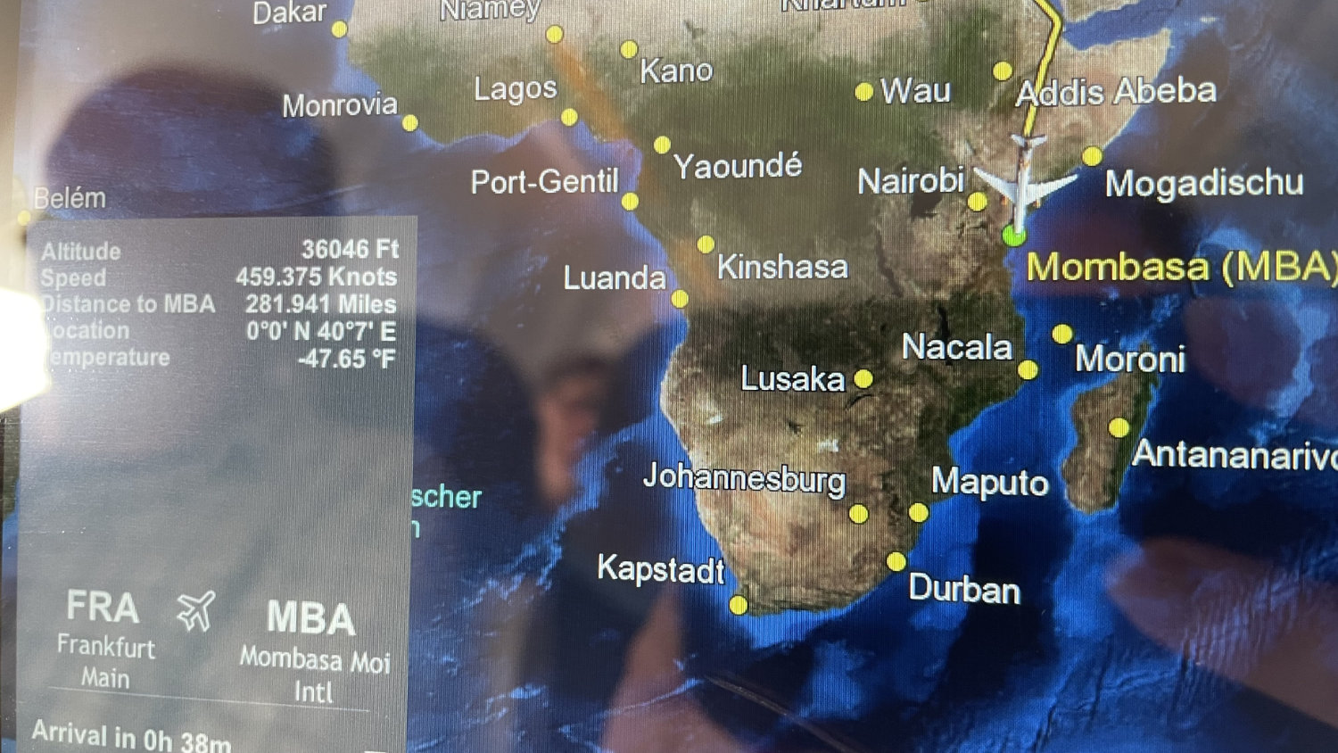 Man man man, darauf mussten wir lange warten. Irgendwie lagen unsere Ziele bisher immer nur auf der Nordhalbkugel, umso aufgeregter waren wir, als wir am 22.5.2023 um 6:17 Uhr in 10986 Metern Höhe bei den Koordinaten 0°00’00.0″N 40°07’00.0″E zum ersten Mal den Äquator überquerten. 😃