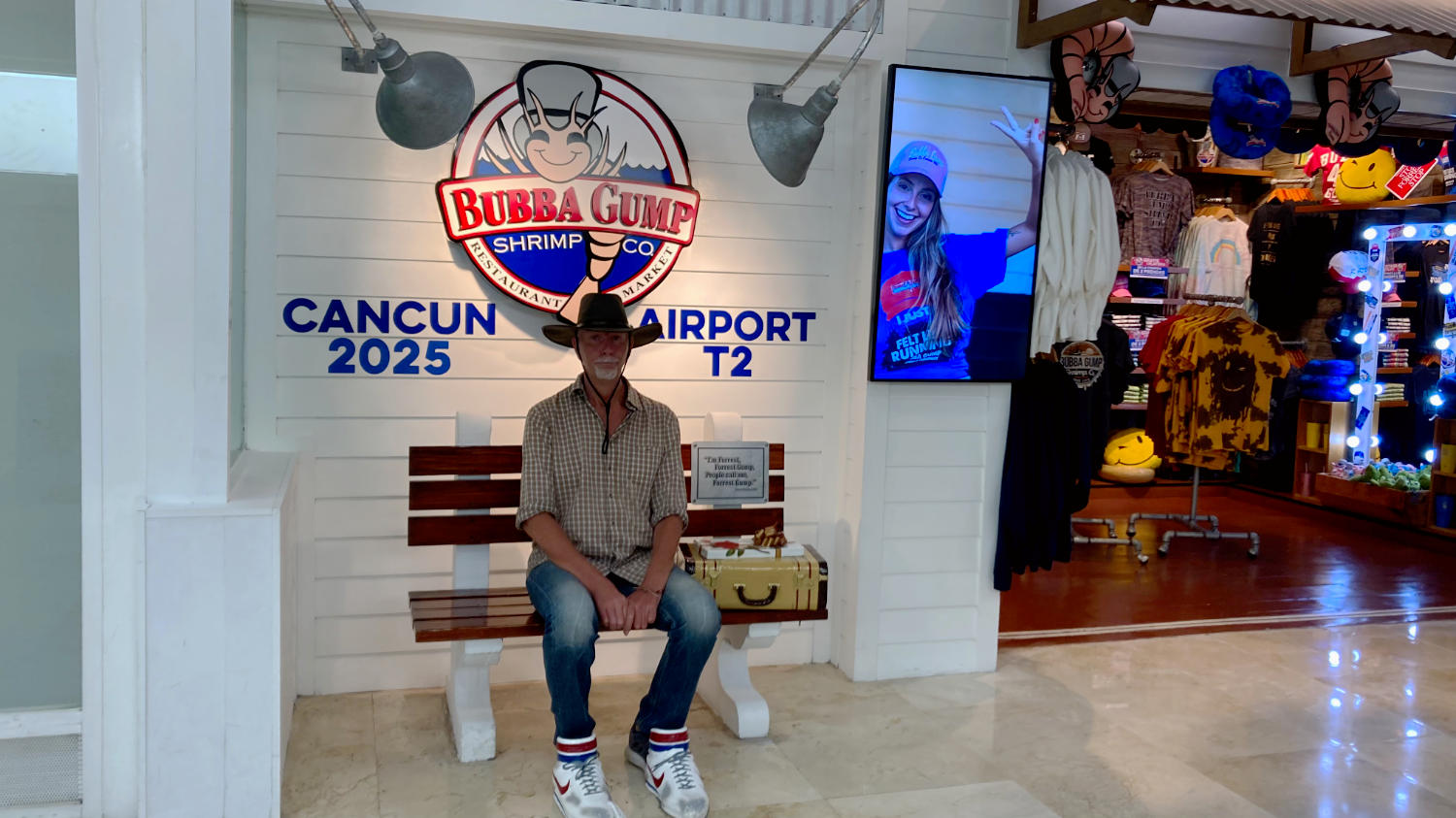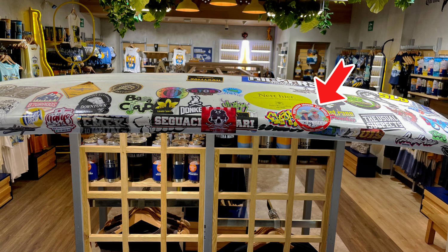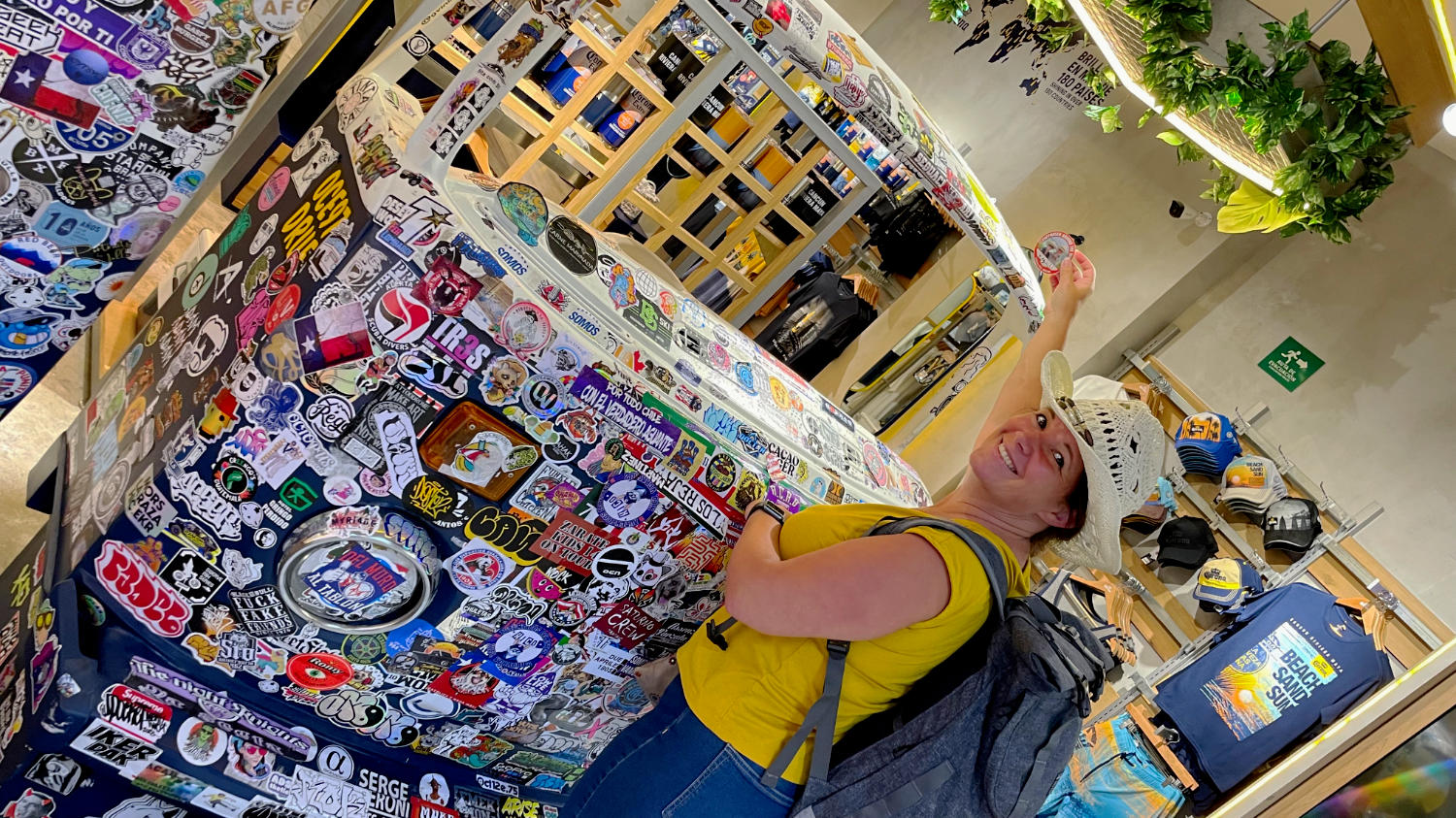 Im Corona Shop gleich nach der Sicherheitskontrolle für Inlands-Flüge lacht uns die Schnauze eines komplett mit Stickern beklebten VW Bus an. Wir fragen, ob wir auch einen Sticker hinterlassen dürfen. Wir dürfen. 😊