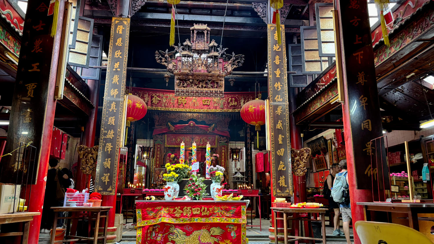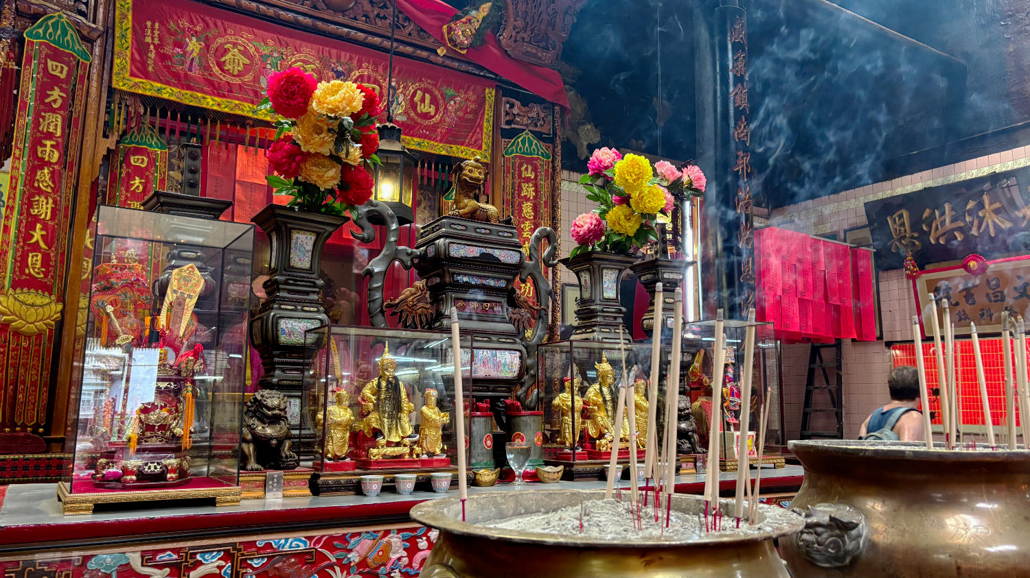Wir schauen uns als erstes den Sin Sze Si Ya Temple an, einem in einem Hinterhof gelegenen, atmosphärischen, kleinen, chinesischem Tempel, von dem aus auch gleich mal diese chinesischen Räucherstäbchen verpackt und in alle Welt geschickt werden. Seltsame Kombi, ist aber so. 😅