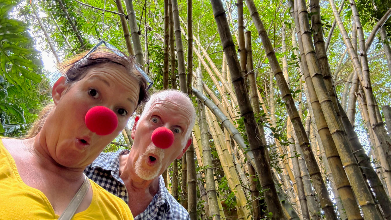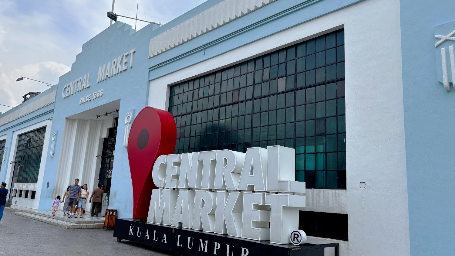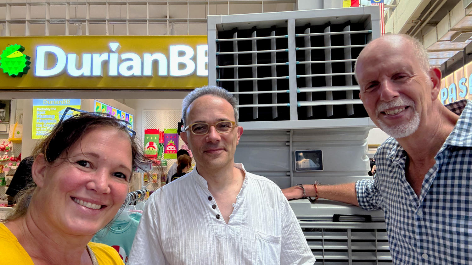 Unweit des China-Räucherstäbchen-Versand-Tempels entdecken wir den Central Market und seine daneben liegende Straße mit den bunten Häuschen. Uns zieht es irgendwie zuerst in die alte Markthalle. Schicksal? Denn auf dem ersten Blick gefällt uns die historische Markthalle nicht einmal sehr. Man hat ihr mit zuvielen modernen Geschäften irgendwie die Atmosphäre genommen, die sie zweifellos mal hatte. Wir geben der Markthalle trotzdem eine Chance und wollen wenigstens ein paar Minuten hindurch schlendern. Nach ein paar Metern steht auf der rechten Seite eines dieser großen Standgebläse, welches kühle Luft in die Halle pustet. Vor dem Gebläse steht ein Mann, der es scheinbar genießt, sich vom Standgebläse anpusten zu lassen. Diese Leidenschaft teilt die große Pappnase ja auch und so stellen wir uns dazu. Nicht lange und wir kommen mit dem zuerst Angepusteten ins Gespräch. Auf Englisch natürlich. Wir amüsieren uns machen ein albernes Foto und sind schon im Begriff, uns zu verabschieden, als die große Pappnase den zuerst Angepusteten fragt, woher er denn kommt. Er antwortet: „from Germany“. 😄