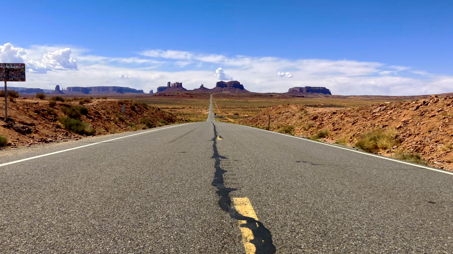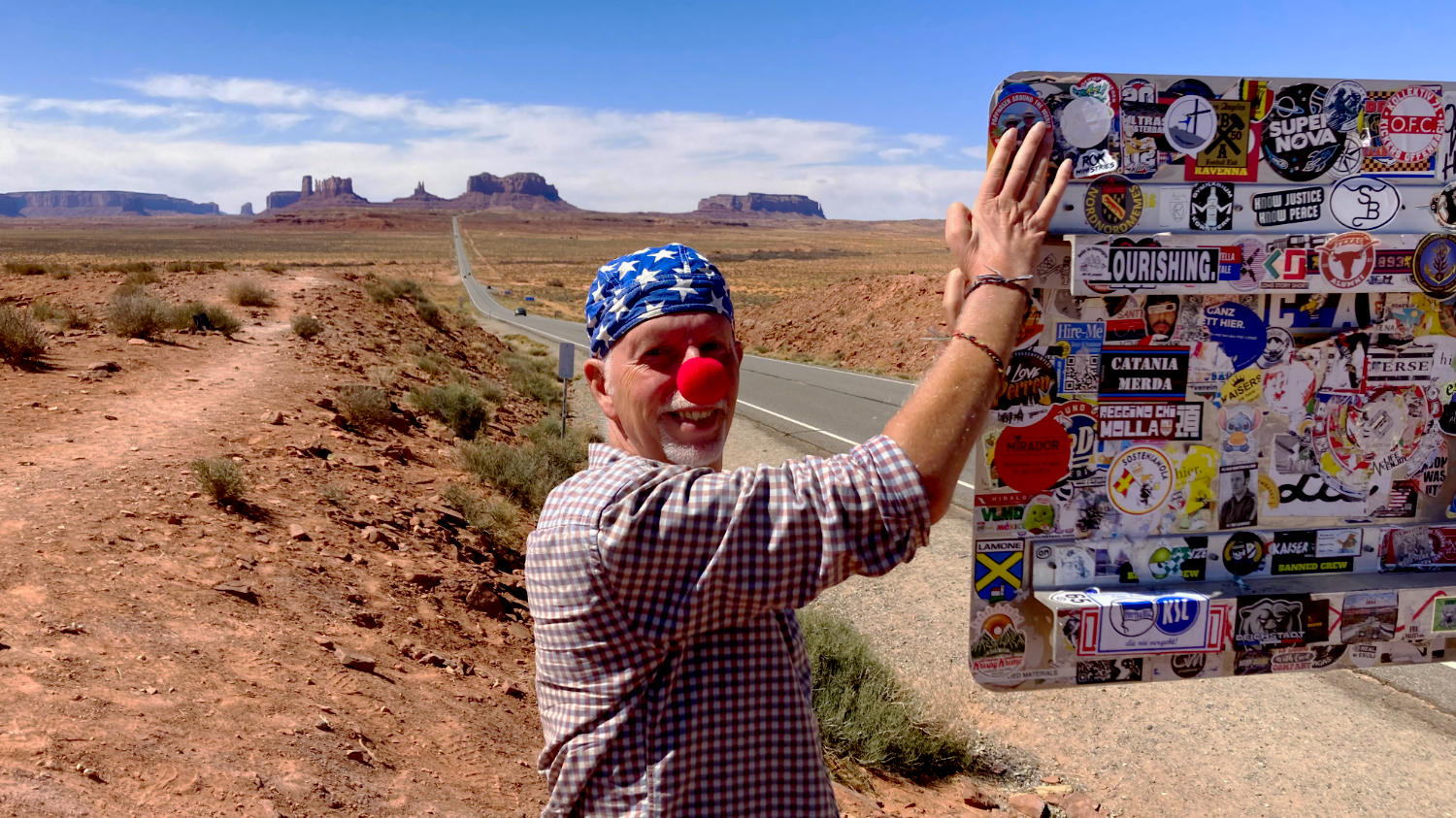 Knapp 15 Meilen vor dem Monument Valley, liegt der Forrest Gump Point. Jeder kennt die Szene, wo Forrest Gump durch die USA läuft und auf der Straße mit dem Monument Valley hinter sich, unvermittelt stehen bleibt und seinen Anhängern erklärt, dass er müde sei und jetzt nach Hause möchte. Natürlich halten wir dort auch, schießen ein paar Fotos und hinterlassen einen Pappnasen Sticker.