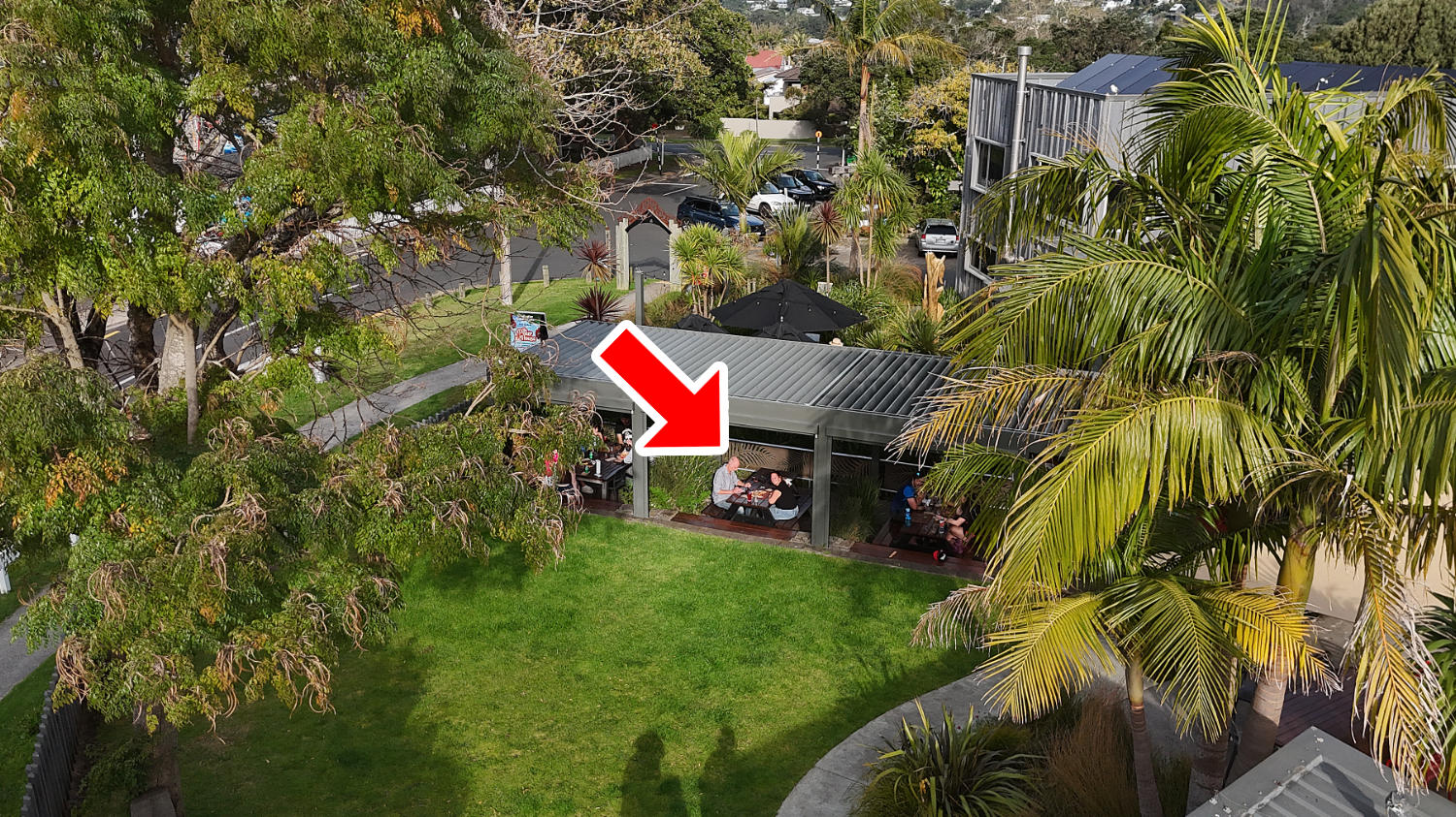 Nach ein paar Minuten sind wir schon am Hahei Beach Parkplatz. Auf dem Weg zu unserem Parkplatz kommen wir an der The Pour House and The Coromandel Brewing Company vorbei. Wir praktisch! Wir sind eh hungrig und vor allem durstig. Wir trinken ein paar kühle Bier, erfrischende Cranberry Säfte (also die hübsche Pappnase trinkt das Bier und die große Pappnase bekommt den Saft 😅) und hauen uns eine leckere Pizza vor den Kopf. Das ganze bei bestem Wetter – so lässt es sich leben. 😄
