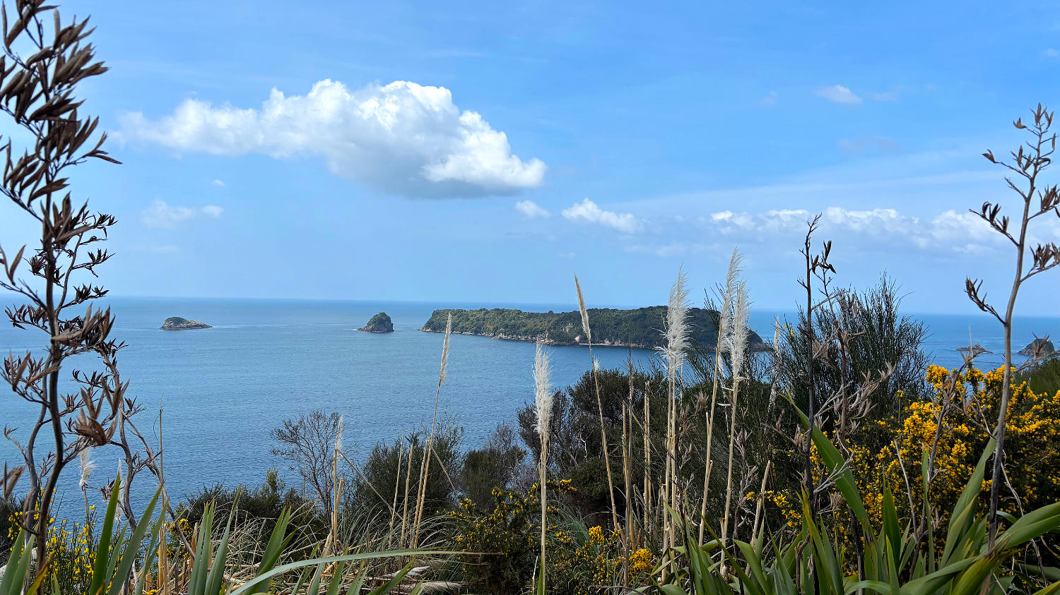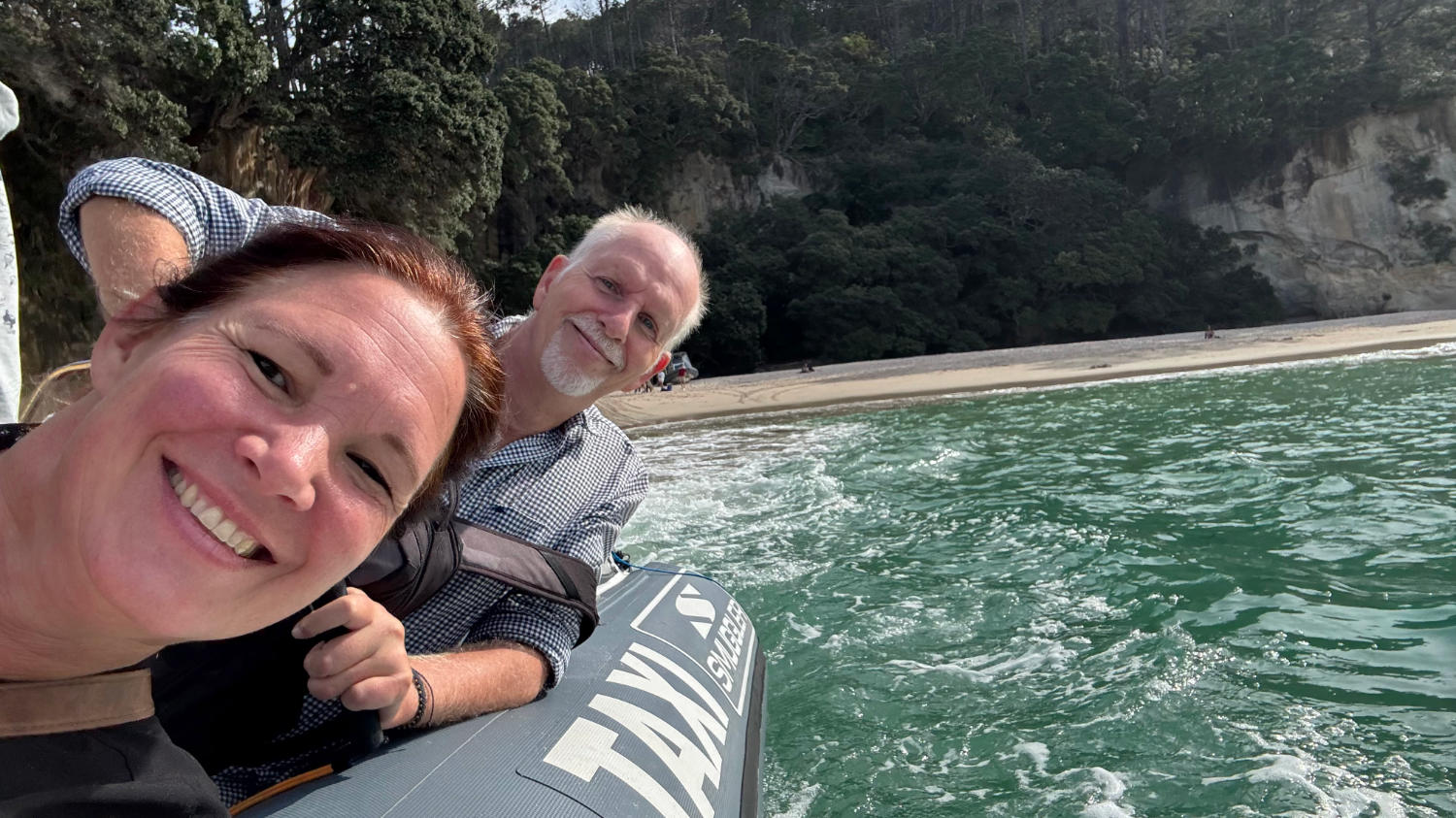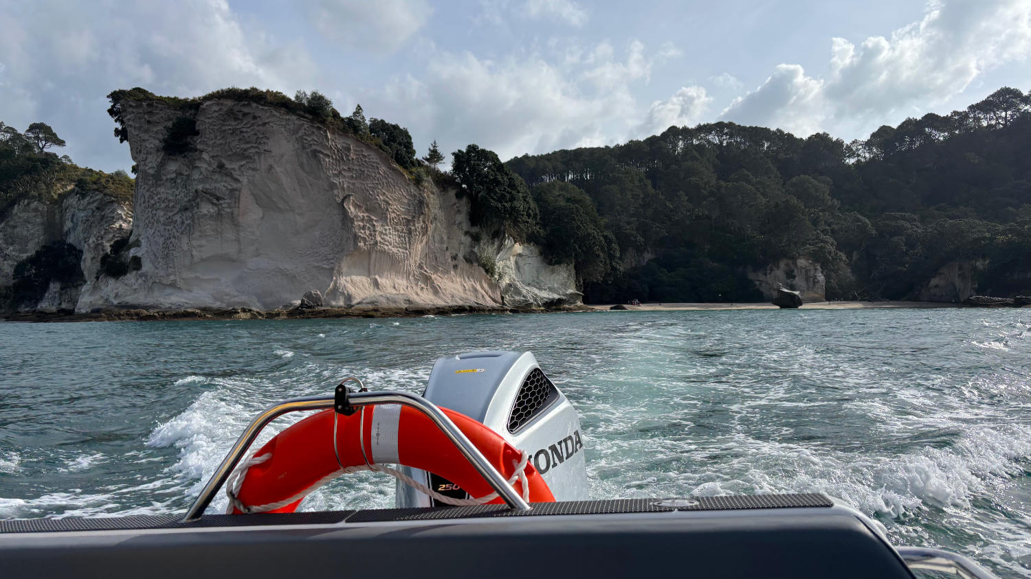 Bei strahlendem Sonnenschein machen wir uns also auf den Weg zum 160 Kilometer entfernten Cathedral Cove Beach. Nach nicht ganz zweieinhalb Stunden parken wir das Auto auf dem Cathedral Cove Park & Ride Parkplatz und nehmen das Shuttle zum 2 Kilometer entfernten Beginn des Cathedral Cove Walk. Dieser ist nicht ganz ohne. Der Weg ist toll ausgebaut, bietet schöne Aussichten und nach 1 Kilometer gibt es sogar einen Eiswagen und Toiletten, allerdings geht es ordentlich bergauf und bergab. Das ist auch der Grund, warum wir zurück mit dem Boot fahren – das waren uns die umgerechnet 20€ pro Person wert. 😅