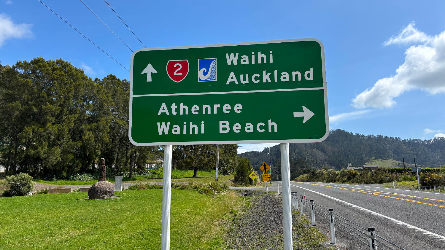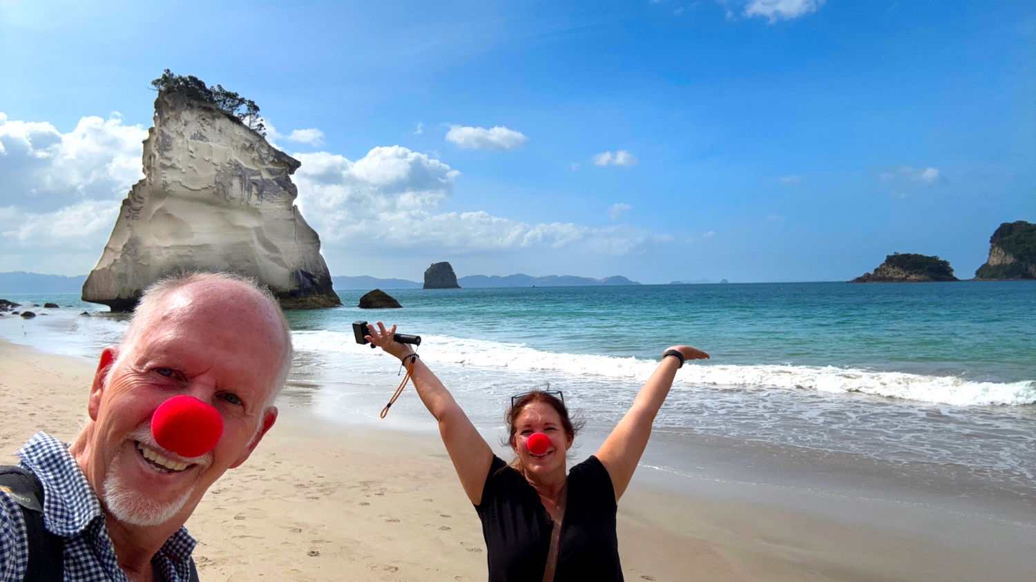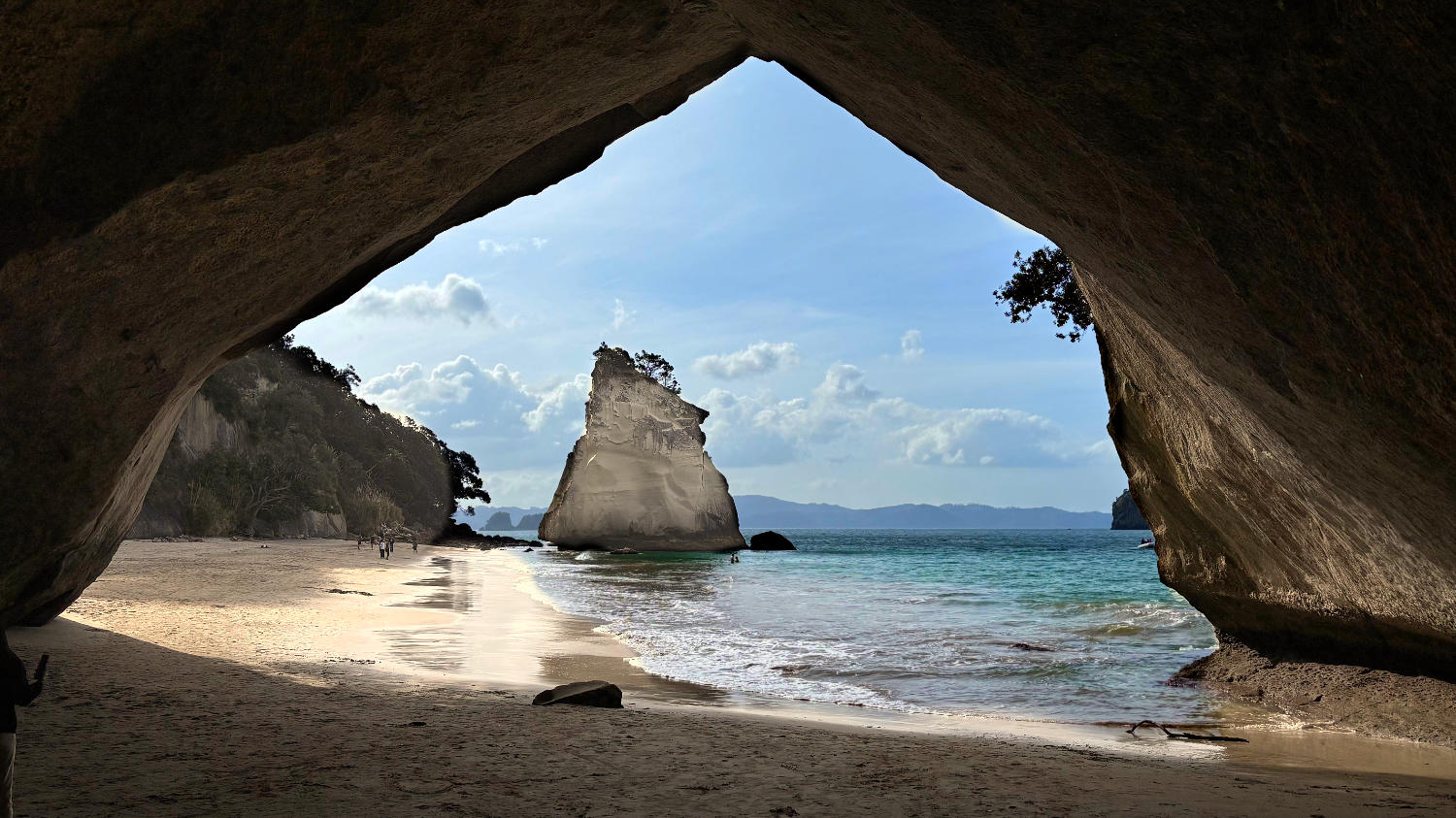Bei strahlendem Sonnenschein machen wir uns also auf den Weg zum 160 Kilometer entfernten Cathedral Cove Beach. Nach nicht ganz zweieinhalb Stunden parken wir das Auto auf dem Cathedral Cove Park & Ride Parkplatz und nehmen das Shuttle zum 2 Kilometer entfernten Beginn des Cathedral Cove Walk. Dieser ist nicht ganz ohne. Der Weg ist toll ausgebaut, bietet schöne Aussichten und nach 1 Kilometer gibt es sogar einen Eiswagen und Toiletten, allerdings geht es ordentlich bergauf und bergab. Das ist auch der Grund, warum wir zurück mit dem Boot fahren – das waren uns die umgerechnet 20€ pro Person wert. 😅